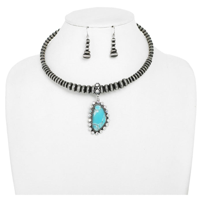Impress with Western flair in the stunning Western Beaded Stone Pendant Collar Necklace. Featuring an adjustable 16" Navajo pearl beaded necklace with an eye-catching oval turquoise pendant and matching earrings, this jewelry set will make a statement in any setting. Made with high-quality crystal rhinestones and semi-precious stones, this set is perfect for any cowboy or cowgirl.