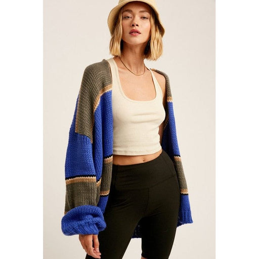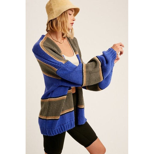 Multi striped open cardigan sweater Long sleeves, side seam pockets, loose fit. Model is 5' 10" 32-26-35 and wearing a size Small 100% acrylic.