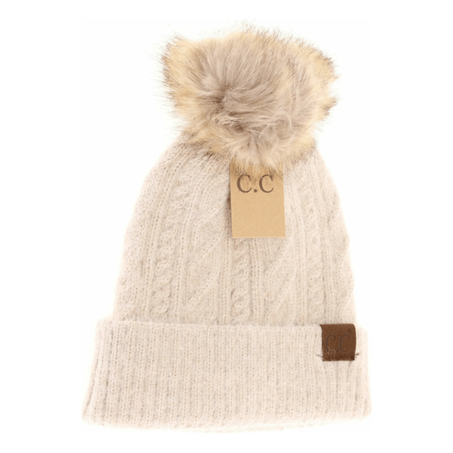 Soft Cuff Cable Knit Fur Pom C.C Beanie