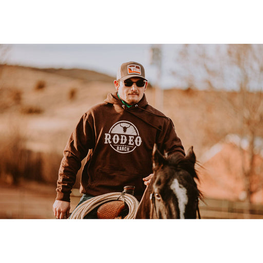 The Brushy Hoodie by Rodeo Ranch features a unisex fit body in chocolate brown with white screen-printed art. Open Pack Pick Your Sizes Min of 8 units