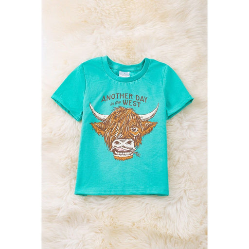 Another Day In The West" Aqua Highland Cow Printed Boys Tee-shirt. "The perfect shirt for your little adventurer! Let your child's imagination run ...