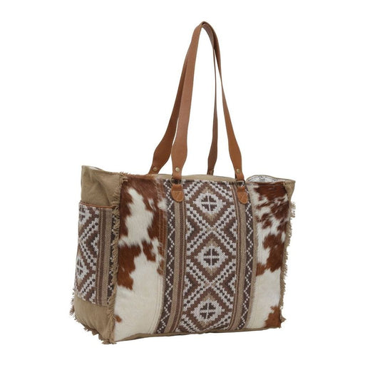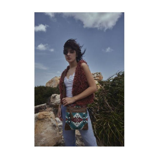 The Rainfyre Leather Hairon Bag is a fashion statement. Crafted with upcycled tribal-inspired woven rug and caramel leather, plus fine stitching, t...