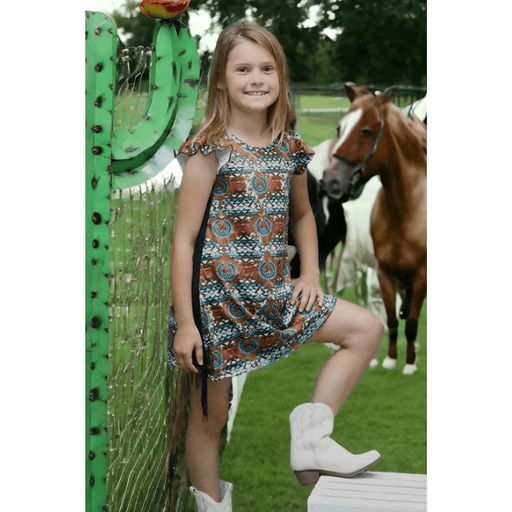 Top features with "LET'S GO GIRLS" & Boots & Cowgirls hat printed on brown background with short sleeves. Serape printed bell bottom with ...