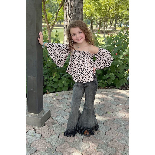 View full detailsBrown off shoulder top cow printed bell bottom 2pc girls set