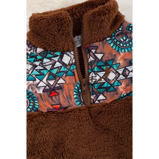 Top features with "LET'S GO GIRLS" & Boots & Cowgirls hat printed on brown background with short sleeves. Serape printed bell bottom with ...