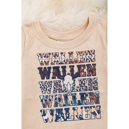 Top features with "LET'S GO GIRLS" & Boots & Cowgirls hat printed on brown background with short sleeves. Serape printed bell bottom with ...