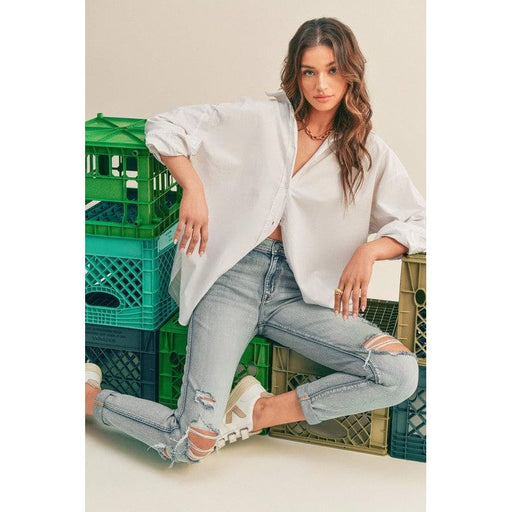 Elevate your denim game with our Kancan High Rise Distressed Mom Jeans. These medium stone wash jeans feature a comfortable stretch, relaxed mom fi...