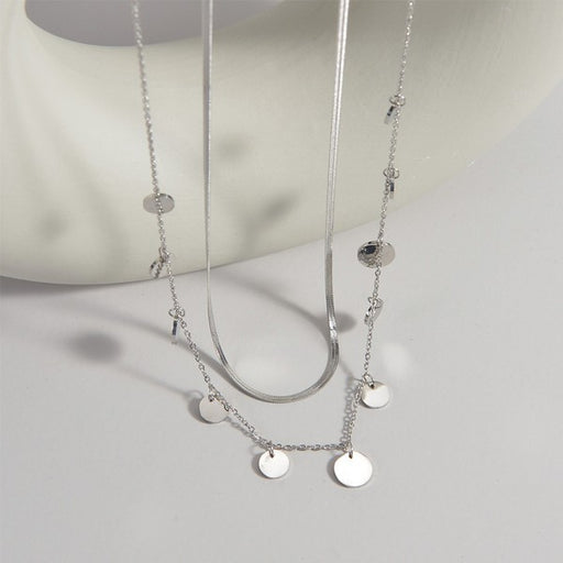 Elevate your style with our 18K Stainless Steel Tarnish Free Disc Necklace. This stunning piece features layered discs and a herringbone chain desi...