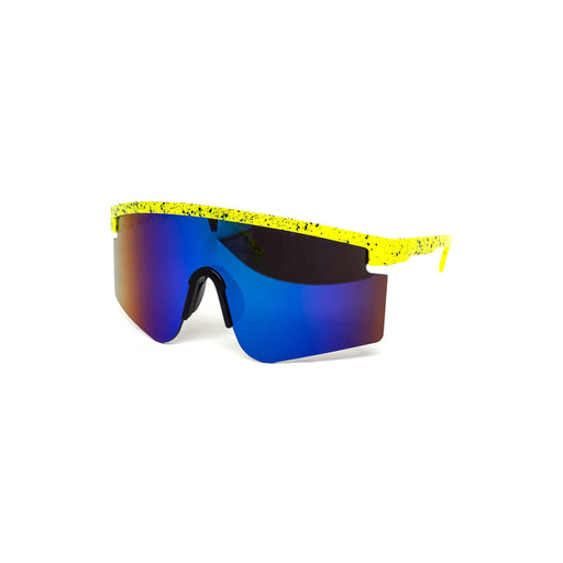 Full size sport shield party style with assorted paint splash frames and assorted burnt mirror lens.