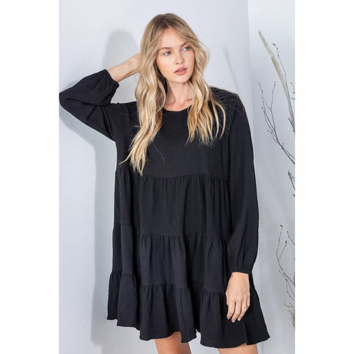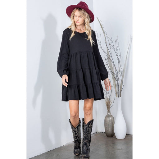 Babydoll tiered dress with shimmery fabrication! This dress features a sweetheart neckline, puff sleeves with empire bustline. Slightly shorter tha...