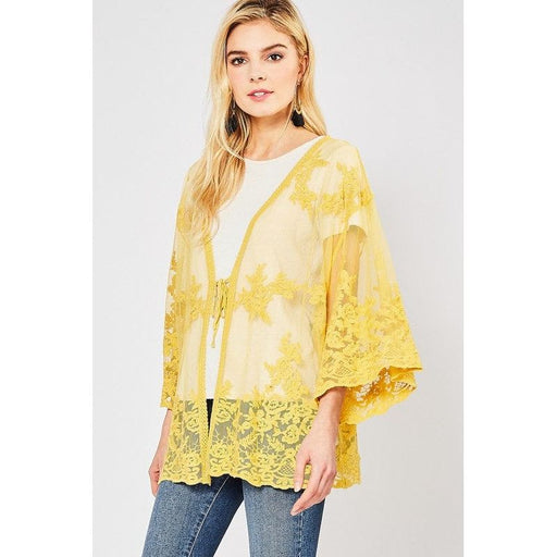 Lace cardigan featuring self-tie closure detail at front. Semi-sheer. Woven. Lightweight. 60%COTTON 40%POLYESTER Model is 5'9" and wearing size Small.
