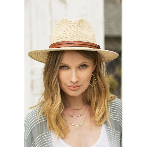 *ruggine*Woven panama hat with faux leather double band accent*100% paper *approx. Circumference: 22.25"