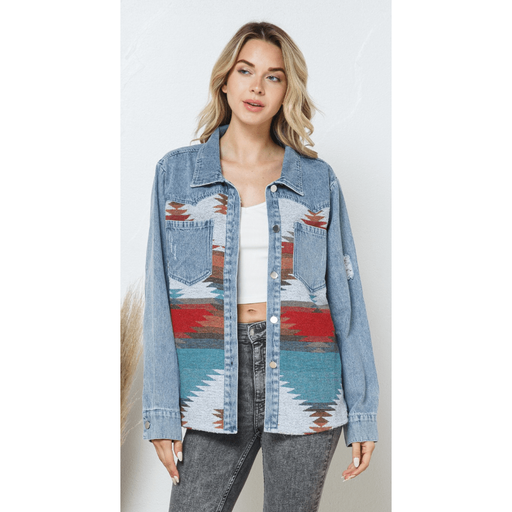 Washed denim contrast aztec western yoke shirt jacket. Denim part 90% cotton, 10% polyester Aztec part: 90% polyester, 10% wool