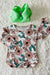 Romper features WILD SOUL & Flower & jewel prints on tan background with long sleeves and snap buttons at bottom.