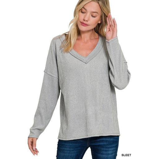 Ribbed V-neck Drop Shoulder Top-brushed Total Body Length: 25", Chest: 44" Approx.- Measured From Small * Color May Vary Slightly Due To Monitor Re...