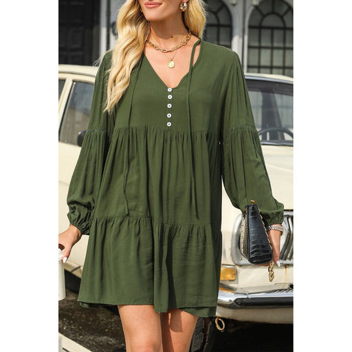 Puff Sleeve Buttoned Tiered Ruffled Mini Dress