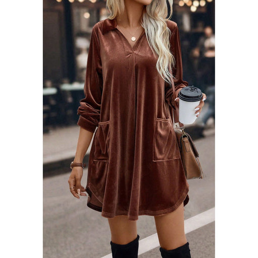 Indulge in luxurious elegance with our Collared V Neck Two Pockets Shift Velvet Dress. Made from high-quality fabric, this dress offers a soft, sop...
