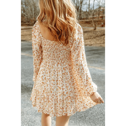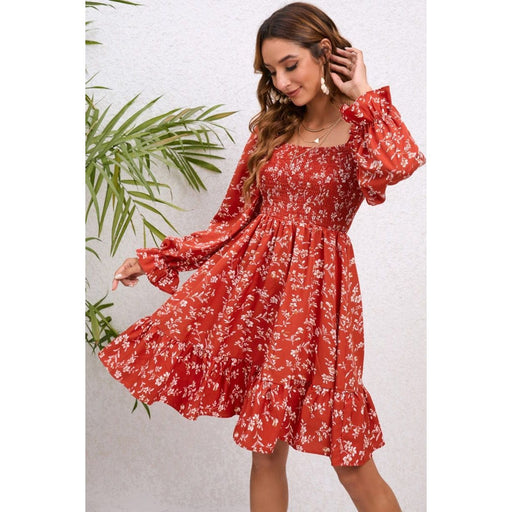 Pink Floral Puff Sleeve Square Neck Smock Ruffled Dress