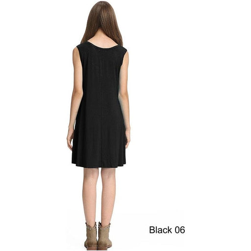 Bamboo spandex knitted tank swing dress with side seam pockets.