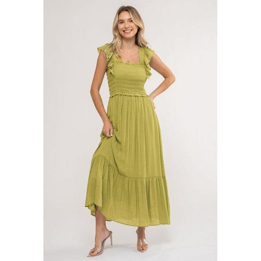Indulge in effortless elegance with our Smocked Ruffle Sleeve Midi Dress. The smocked detailing and ruffle sleeves add a touch of femininity, while...