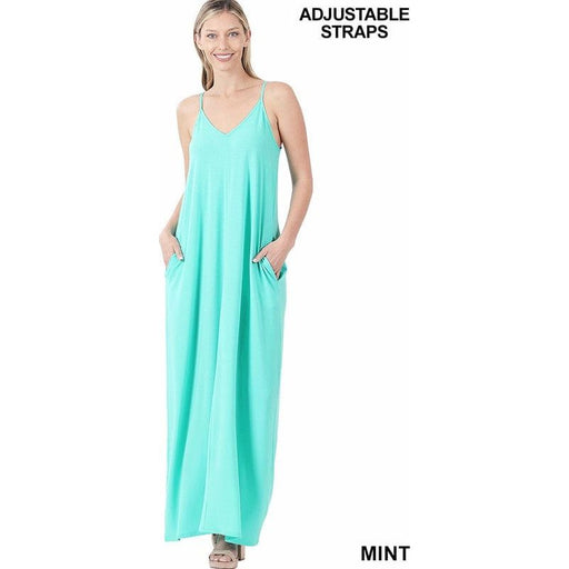 V-NECK CAMI MAXI DRESS WITH SIDE POCKETS - ADJUSTABLE STRAP TOTAL BODY LENGTH (HIGH POINT BUST): 48.5", BUST: 34" approx. - MEASURED FROM SMALL ...