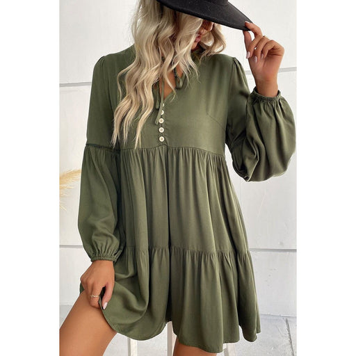View full detailsPuff Sleeve Buttoned Tiered Ruffled Mini Dress