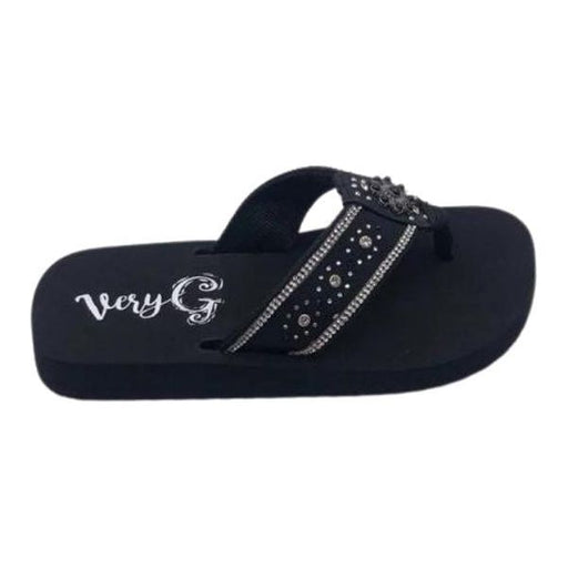 Sparkly flip flops with pink rhinestones and multi colored trim.