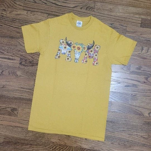 Longhorn cow skull on turquoise leopard background on yellow shirt.