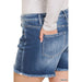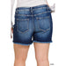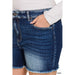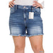 plus size, mid-rise fit, raw frayed hem This women's plus size mid-rise denim shorts feature authentic raw frayed hems and are designed to hug your curves for a flattering fit. With a comfortable stretch fabrication, they provide all-day comfort while still looking stylish and modern.