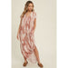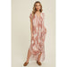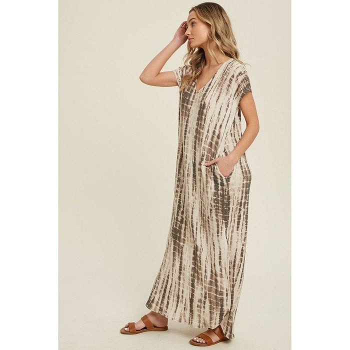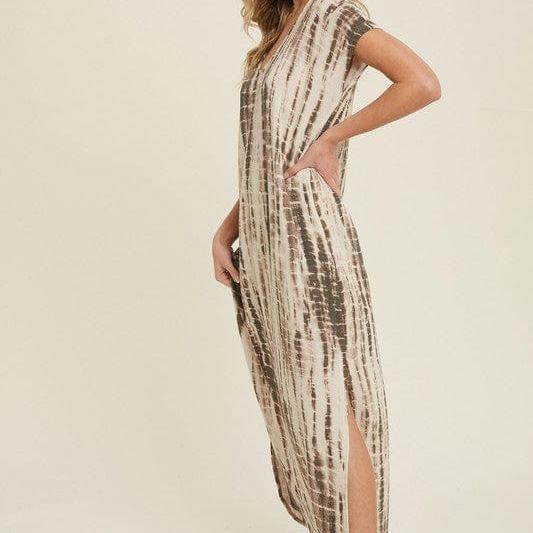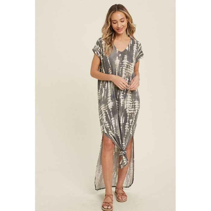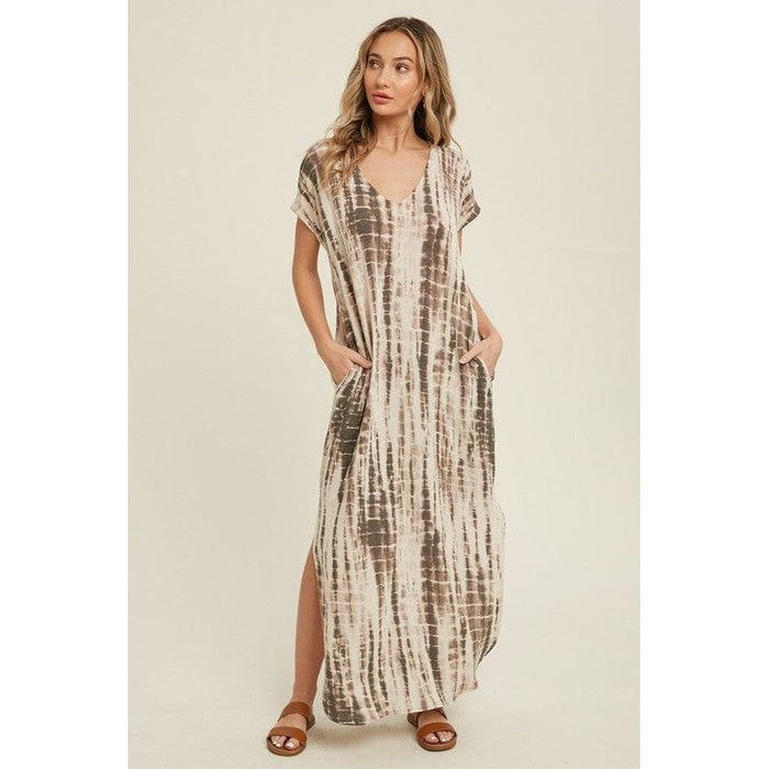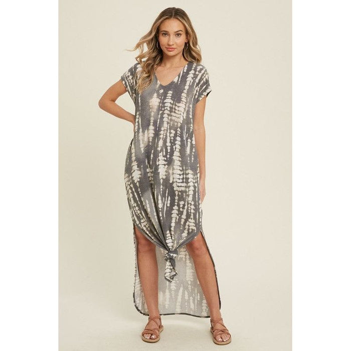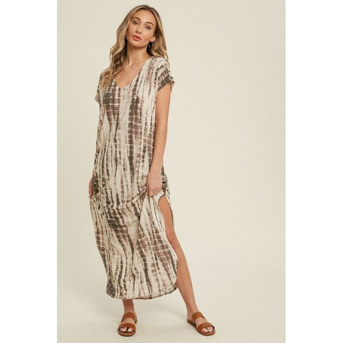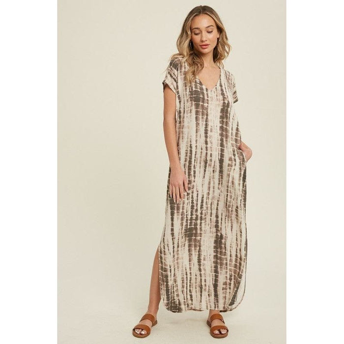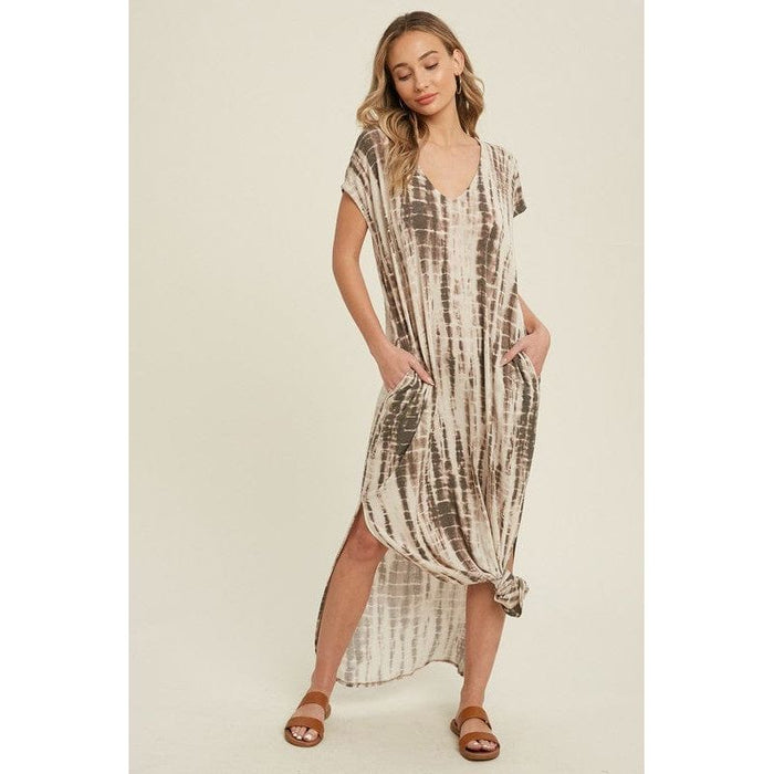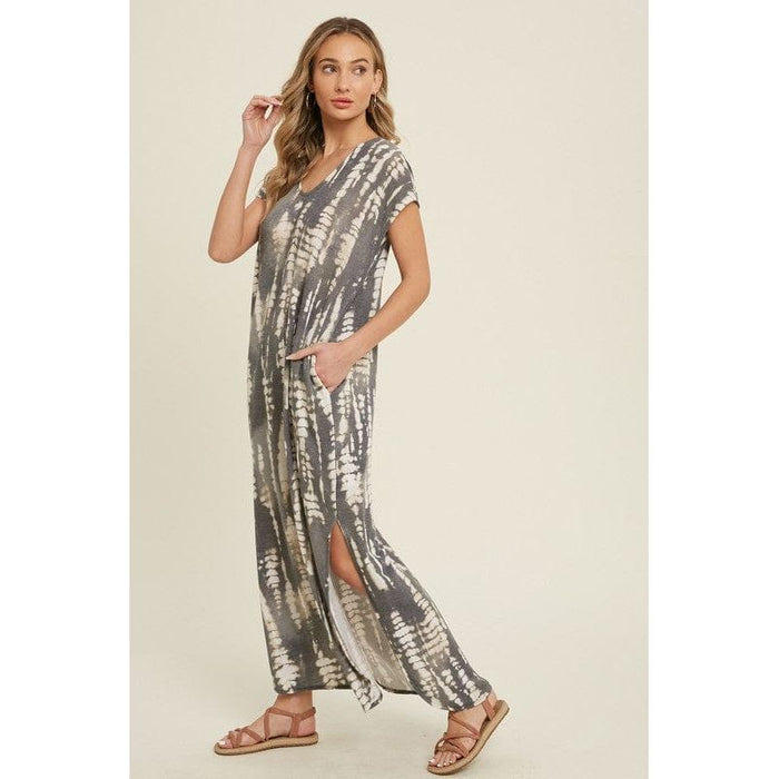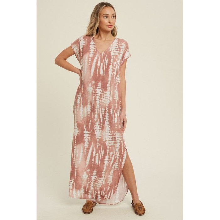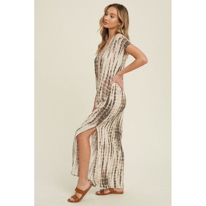 Vestido largo informal de punto con efecto tie-dye, escote en V, manga corta, bolsillos laterales y aberturas laterales en ambos lados. Úselo informal y largo o agregue un nudo en la parte inferior para una apariencia más elegante.