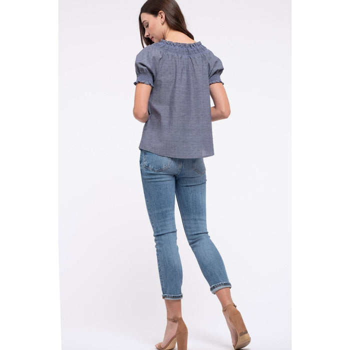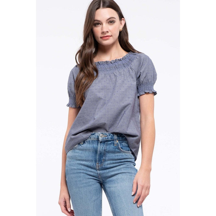 Introducing the Smocked Puff Sleeve Top, crafted with 100% cotton for ultimate comfort! Featuring a smocked boat neckline, textured fabric, elegant swiss dots, and a delicate ruffle trim. Elevate your wardrobe with this versatile and stylish top that will surely be a must-have for any fashion-forward individual. Perfect for any occasion and season!