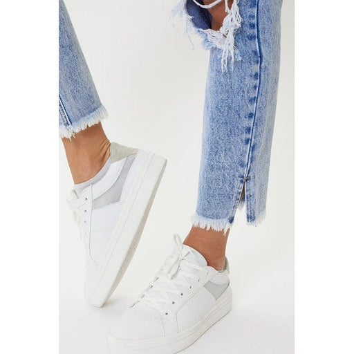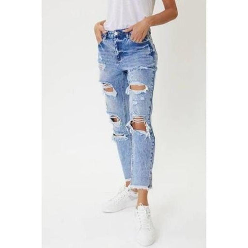 Elevate your denim game with our Kancan High Rise Distressed Mom Jeans. These medium stone wash jeans feature a comfortable stretch, relaxed mom fi...