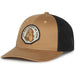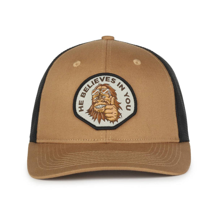 You don’t have to believe in him, but he believes in you. Thumbs up for this woven label scout patch on an old-gold cap cap with black mesh.