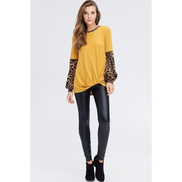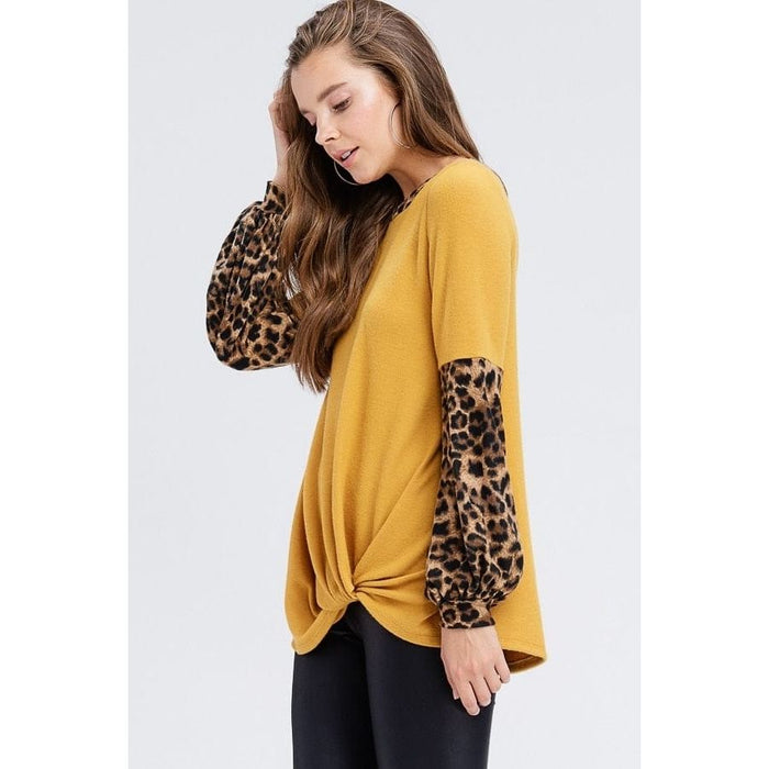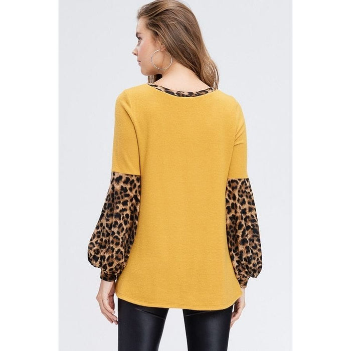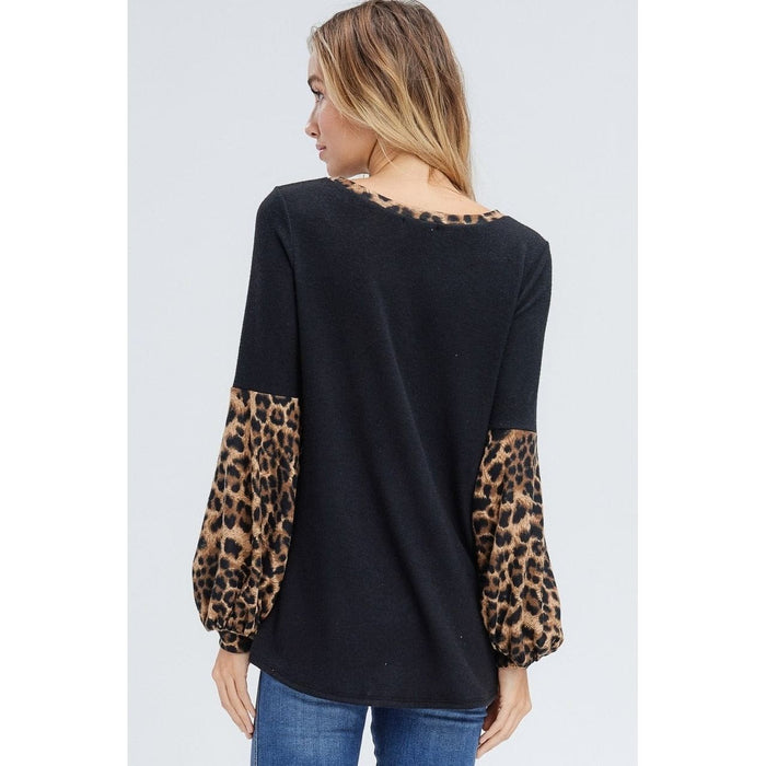 A long sleeve solid knit sweater with a round neck featuring cheetah print puff sleeves