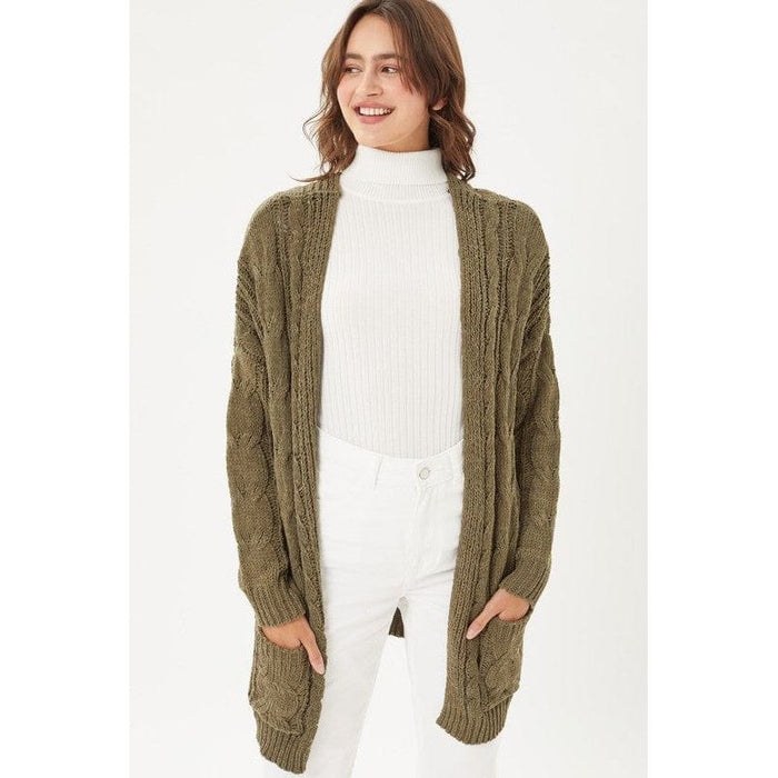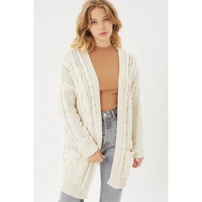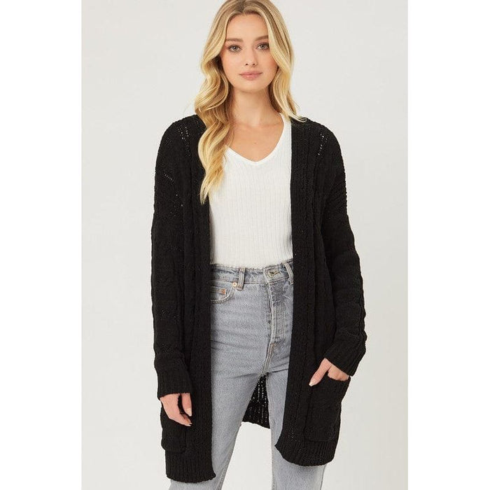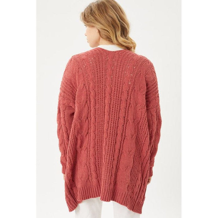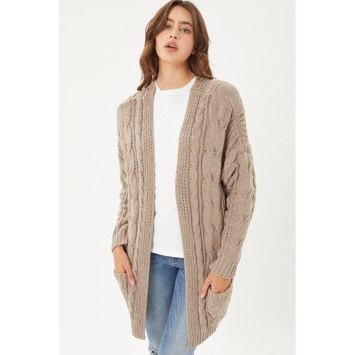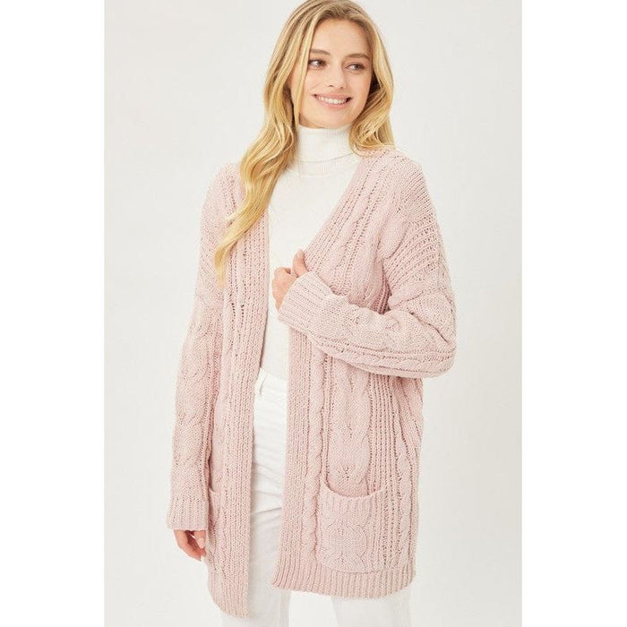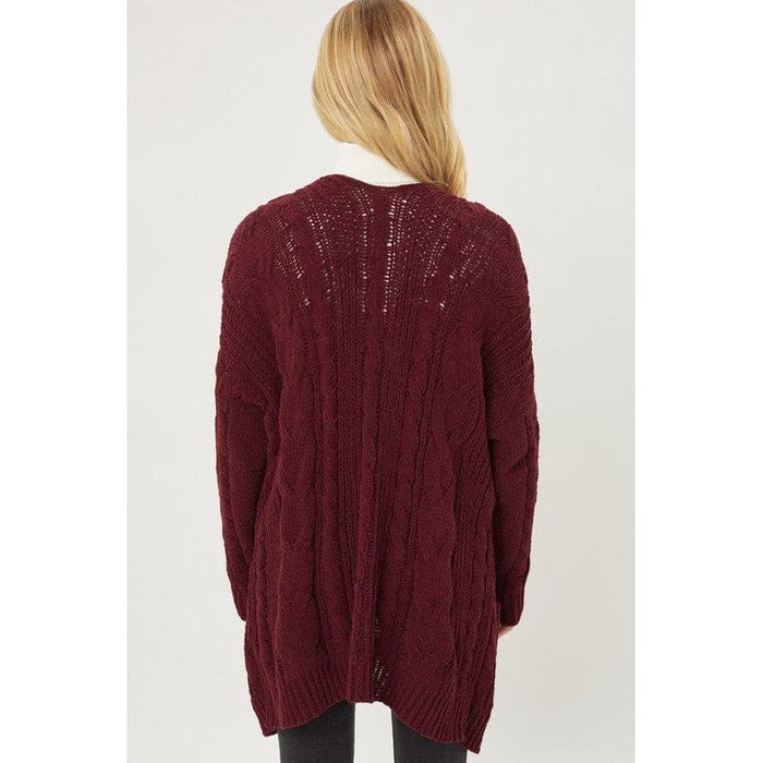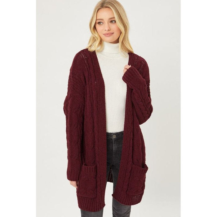 Stay cozy all season long with the Chunky Cable Knit Cardigan. From the draped ribbed hem to the long line bodice and 2 side pockets, this relaxed fit cardigan provides both fashion and function. Lightweight breathable polyester blend fabric is designed to keep you warm while keeping you comfortable. Machine wash and tumble dry. 81% polyester, 19% acrylic.