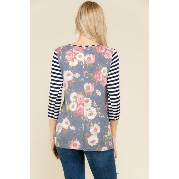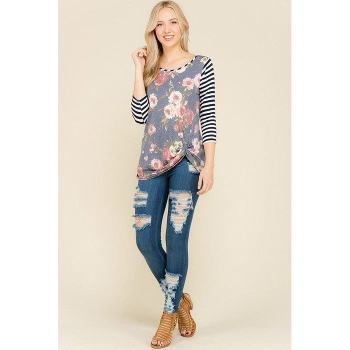 The Floral Print Quarter Sleeve top features a side knot. The shirt is so soft and looks great with a pair of skinny jeans.