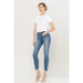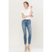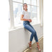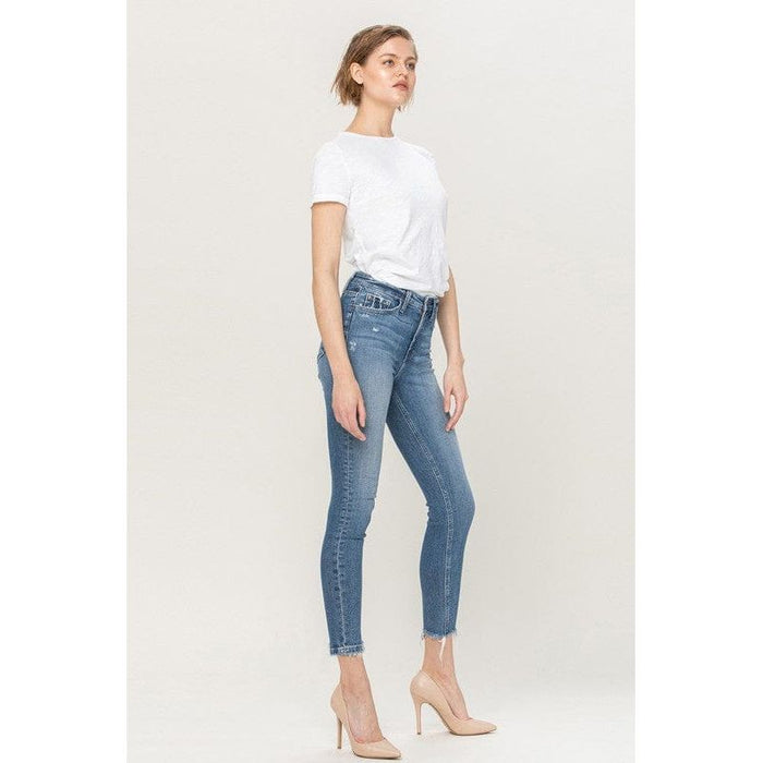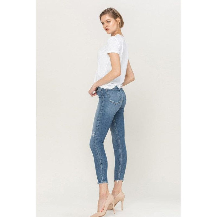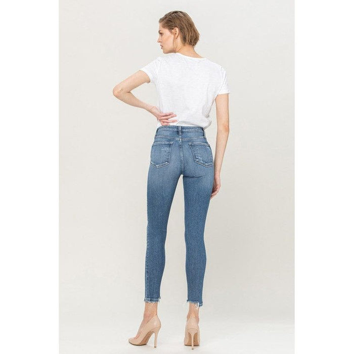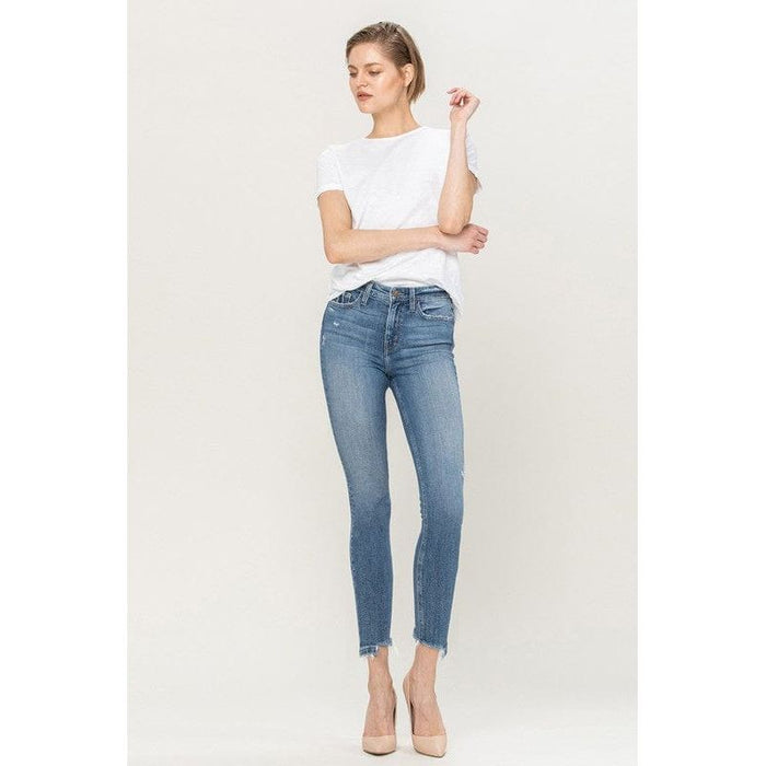 - comfort stretch denim, broken hem line, slightly distressed detail, calf-hugging fit, ankle length, high-waisted and fitted