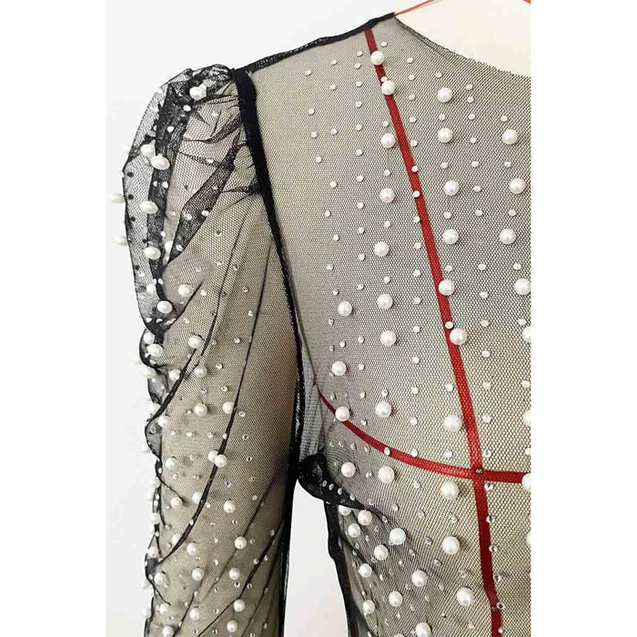 "Take a risk and stand out in this bold sheer mesh top adorned with rhinestones and faux pearls. The round neck and long puff sleeves add a touch of elegance to this adventurous piece.