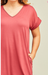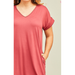 Solid v-neck dress featuring pocket detail at side. Permanent rolled sleeve. Unlined. Non-sheer. Knit. Lightweight.