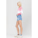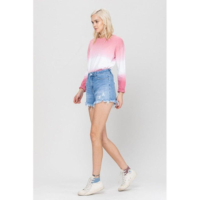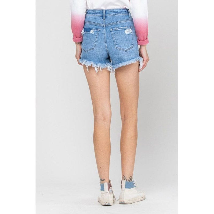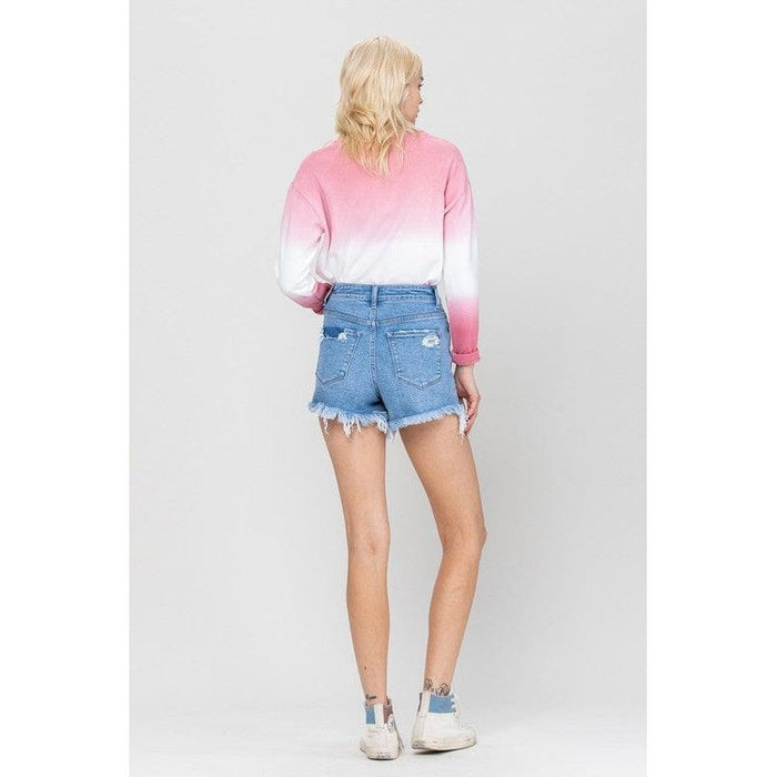 - comfort stretch denim, slightly distressed detail, slouchy fit, rayed hem line, mom jean, high-waisted, 5 pockets